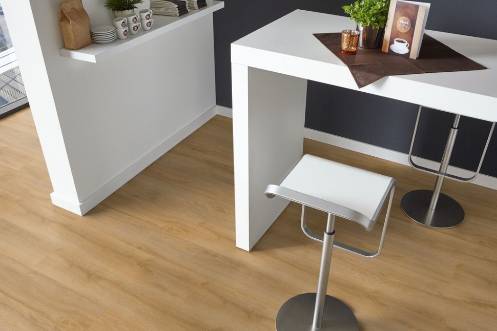 Фаска на краях ламелей придаёт ламинату стильный и современный вид, создавая эффект натурального деревянного пола. А влагостойкость материала гарантирует его надёжность и безопасность при эксплуатации в условиях повышенной влажности, что особенно актуально для кухни и прихожей.