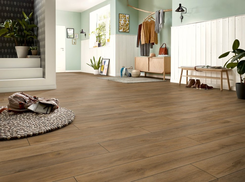 Фаска на краях ламелей придаёт ламинату стильный и современный вид, создавая эффект натурального деревянного пола. А влагостойкость материала гарантирует его надёжность и безопасность при эксплуатации в условиях повышенной влажности, что особенно актуально для кухни и прихожей.